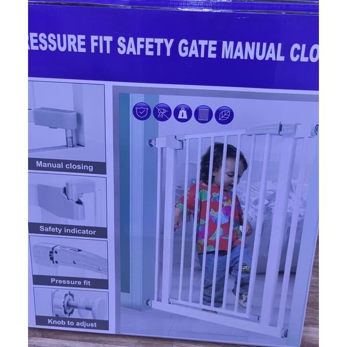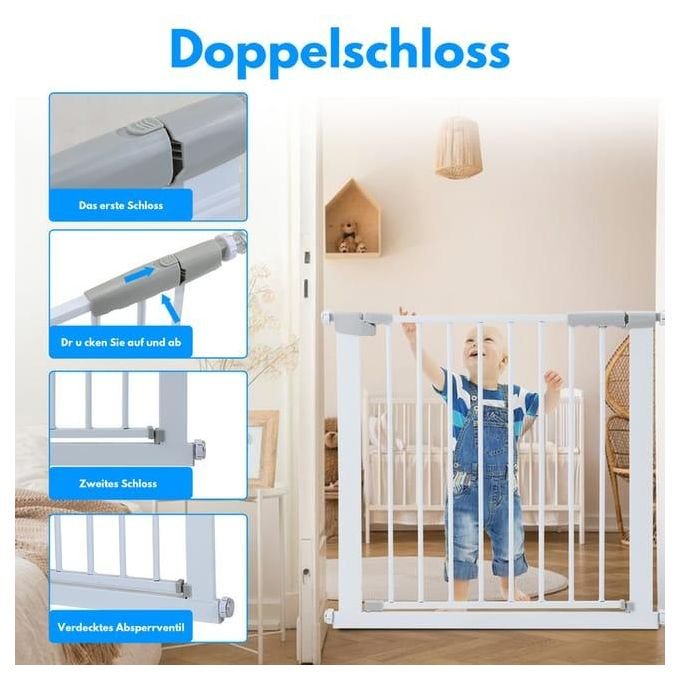 Fixée entre portes ou escaliers grâce à quatre dispositifs réglables, sans perçage nécessaire. Équipée d’une goupille de sécurité et d’une fermeture automatique à moins de 90°, elle protège efficacement les enfants. Dimensions : 75–85 cm de largeur × 80 cm de hauteur. Adaptée à la cuisine, au couloir, aux escaliers, au balcon, à la chambre ou à la salle de bain pour une protection universelle au quotidien
